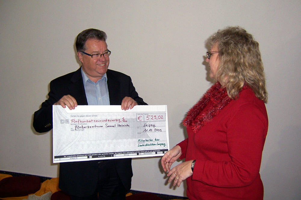 Der Präsident der Landesdirektion Walter Christian Steinbach nutzte die Weihnachtsfeier zudem, Frau Limpert von der Sächsischen Landesschule für Hörgeschädigte Leipzig, Förderzentrum Samuel Heinicke, eine Spende in Höhe von 529,02 Euro zu übergeben. Die Sächsische Landesschule für Hörgeschädigte Leipzig ist eine traditionsreiche Bildungseinrichtung des Freistaates Sachsen für Kinder und Jugendliche, die aufgrund einer Hörschädigung oder einer zentralen Störung der auditiven Wahrnehmung der besonderen Förderung bedürfen.
