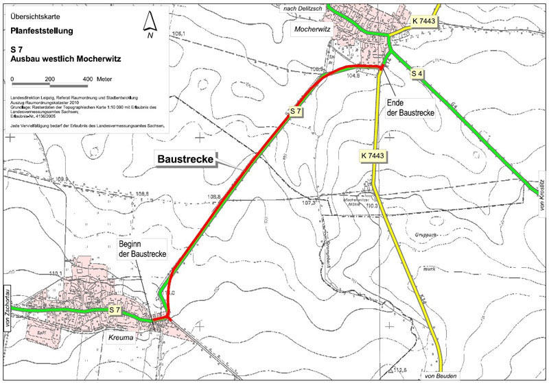 Mit dem genehmigten Vorhaben wird auf einer Länge von knapp zwei Kilometern der grundhafte Ausbau der S 7 zwischen den Ortslagen Kreuma und Mocherwitz erfolgen.