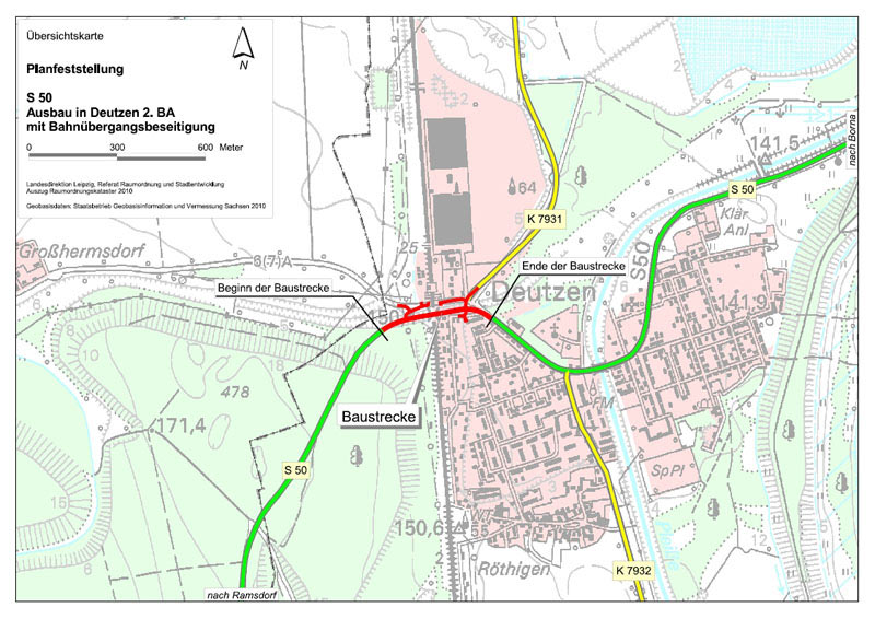 Auf Antrag des Straßenbauamtes Leipzig vom 23.02.2010 hat die Landesdirektion Leipzig den Planfeststellungsbeschluss für den Ausbau der Staatsstraße 50 im Bereich des Bahnübergangs Deutzen (Landkreis Leipzig) erlassen. Damit besteht Baurecht für diese Maßnahme.