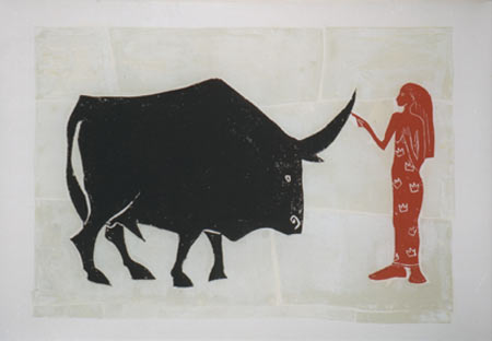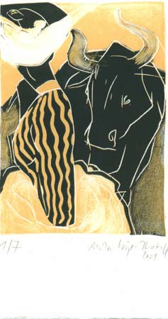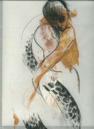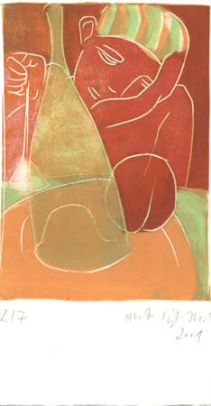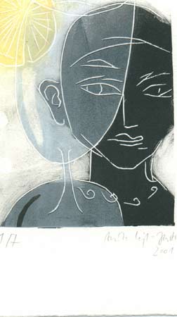 "Die Mitte" wird allerdings kein spannunsfreier Ort sein. Schon die unterschiedliche Technik von spontaner, flüchtiger Zeichnung, beginnender farbiger Entfaltung im Linoldruck und dem längeren Prozess des Ölmalens erzeugt unterschiedliche Perspektiven des Gegenstandes. Erst recht liegt Spannung in den Motiven: So stehen sich in den Arbeiten der Künstlerin nicht nur einmal grazile Weiblichkeit und männliche Kraft im kurzen Moment des Beziehungsgleichgewichts gegenüber.