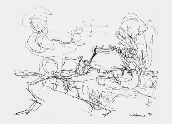 Die Bilder des Elbtals im Dresdner Raum, der Ostseeküste bei Ahrenshoop oder der Boddenlandschaft lassen ebenfalls eine Reduktion der zeichnerischen Form erkennen und zugleich bieten sie dem Betrachter in der verknappten Darstellungsweise sehr viel eigenen Spielraum.