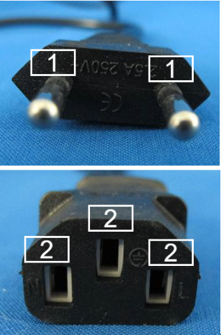 An jedem Pin (1) oder hinter jeder Einkerbung/Buchse (2) befinden sich die Anschlussstellen für die Adern innerhalb des Stromkabels. Im oberen Bild sind also zwei Adern in dem Anschlusskabel verbaut, im unteren drei Adern. Dies deutet auf ein unsicheres Produkt hin.